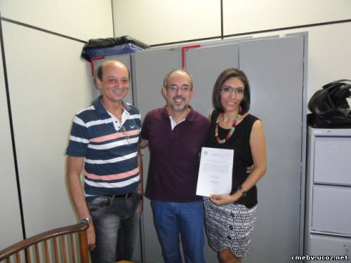 A nova Conselheira Angelita Nóbrega exibindo seu Termo de Posse, feliz por fazer parte do Conselho ao lado do Secretário Adjunto de Educação ao meio e do Presidente do Conselho